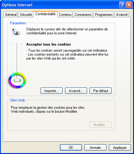Marche à suivre : - Allez dans le menu "Outils" de votre navigateur et sélectionnez l'élément "Options internet..." - Dans la boite de dialogue, choisissez l'onglet "Confidentialité". - Modifiez vos paramètres (cf. illustration ci-contre) puis cliquez sur le bouton OK. |